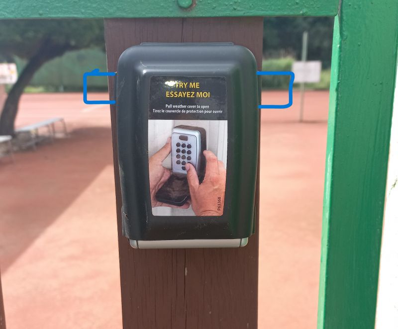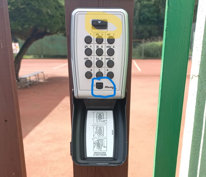 Schránka je umístěna na vstupních dveřích nad klikou. Otevře se zatažením za horní část plastového krytu - vyznačeno modře. Tímto krokem se dostanete k čísleníku. Nejprve ve spodní části (vyznačeno na fotce modře) stlačíte tlačítko směrem dolů (aktivujete číselník). Následně vyťukáte sdělený číselný kód a poté stlačíte horní tlačítko dolů a směrem k sobě (na fotce vyznačeno žlutě). Tímto krokem se dostanete ke klíči, kterým si odemknete vstupní dveře do areálu.